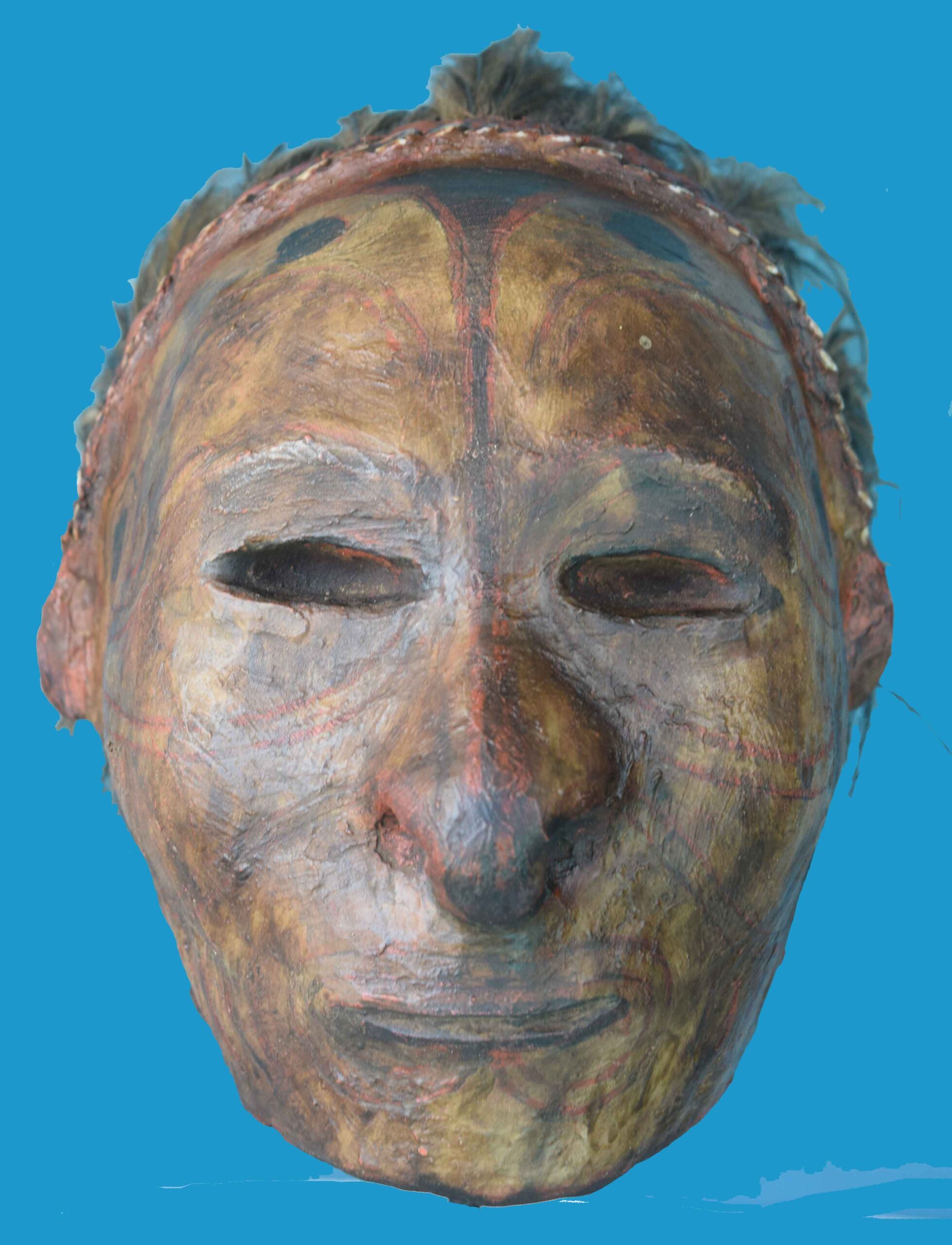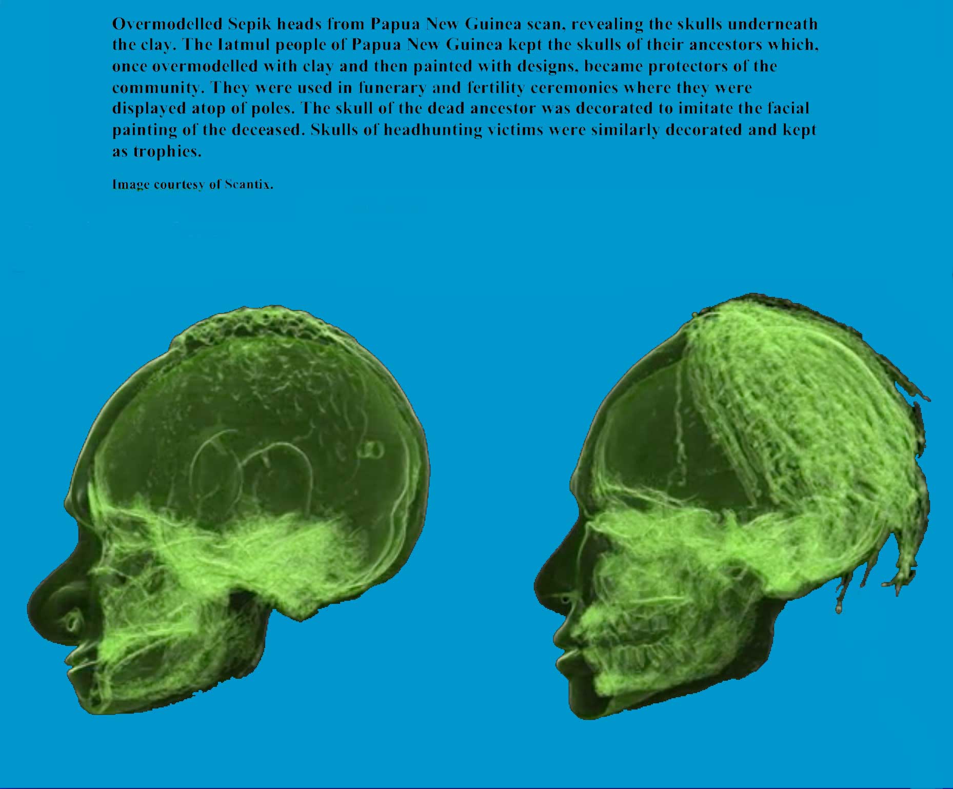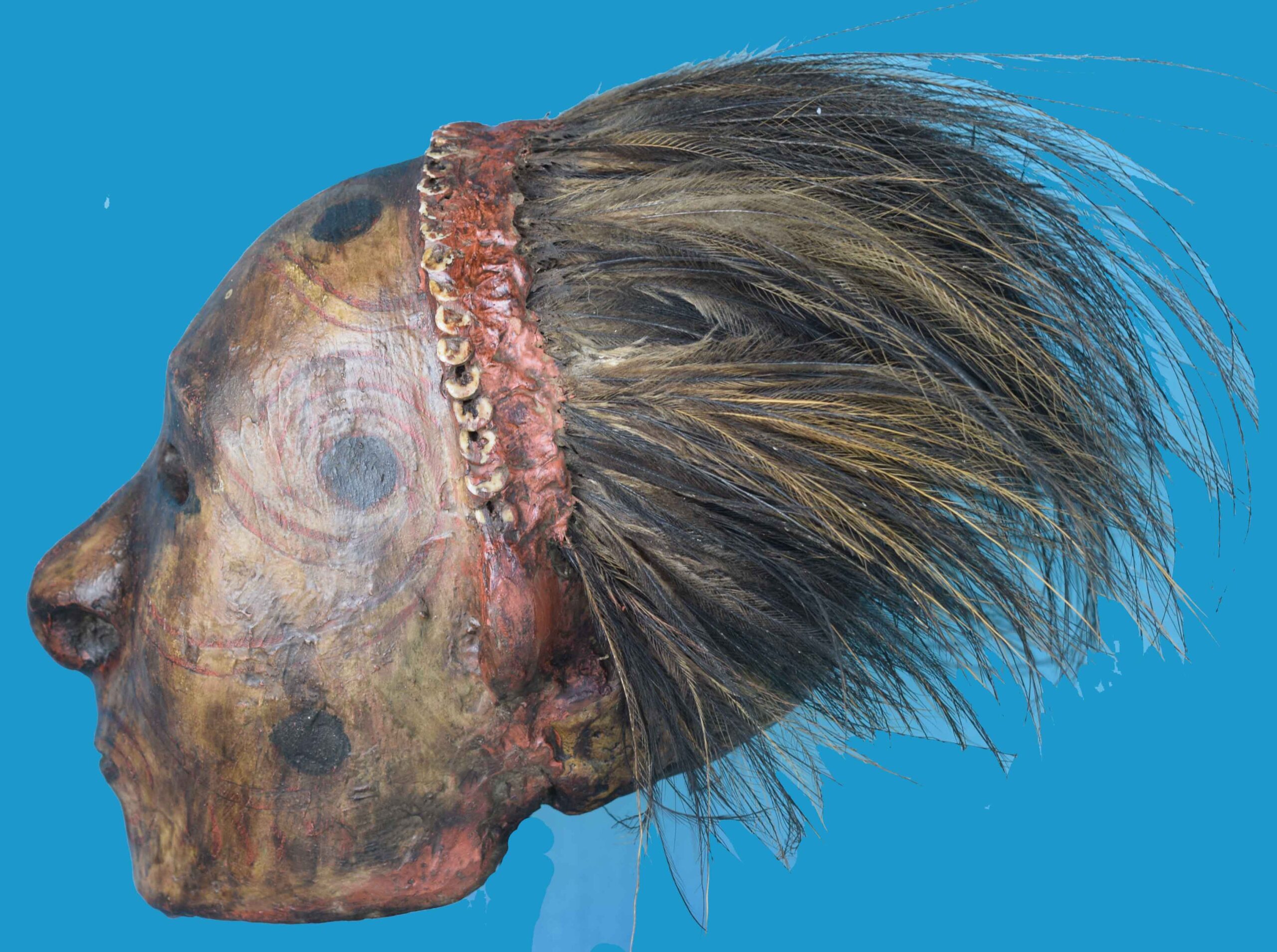 Description          . An Overmodelled Ancestor Skull from the Mid/East Sepik Provinces, probably Sawos, with Cassowary Feather Hair, shellwork and overmodeled with a paste consisting of red clay, lime and tigasso oil. The over modelling of the skulls of men, women and children was once a common practice for both the Iatmul, Abelam and Sawos people. These decorated skulls were often of identifiable ancestors rather than those taken in headhunting raids as trophies, although both could receive similar treatment. Similar examples are on display at various museums including the South Australia Museum and the British Museum. See photo (courtesy British Museum) Collected in 1961 by a patrol officer.